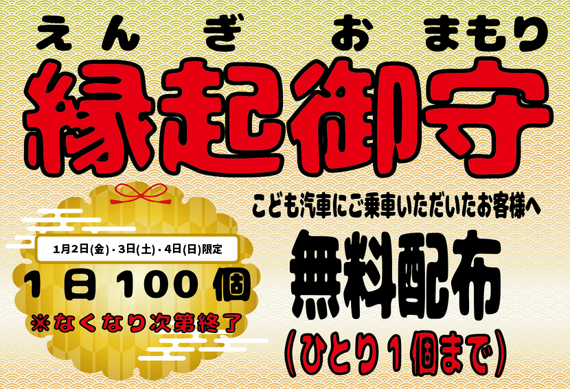 2026年1月2日(金・祝)、3日(土)、4日(日) 縁起御守(すべりどめの砂) 【配布について】 『期間』 2026年1月2日(金・祝)、3日(土)、4日(日)の3日間 『個数』 各日100個 ※無くなり次第終了 『場所』 こども汽車駅2番線ホーム(降り口) 『対象』 こども汽車に乗車いただいたお客様 『制限』 1人1個 『補足』 無くなり次第終了となります