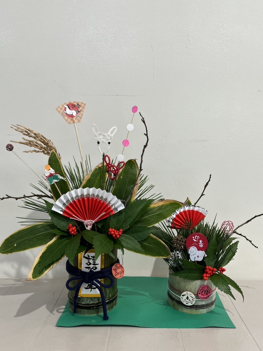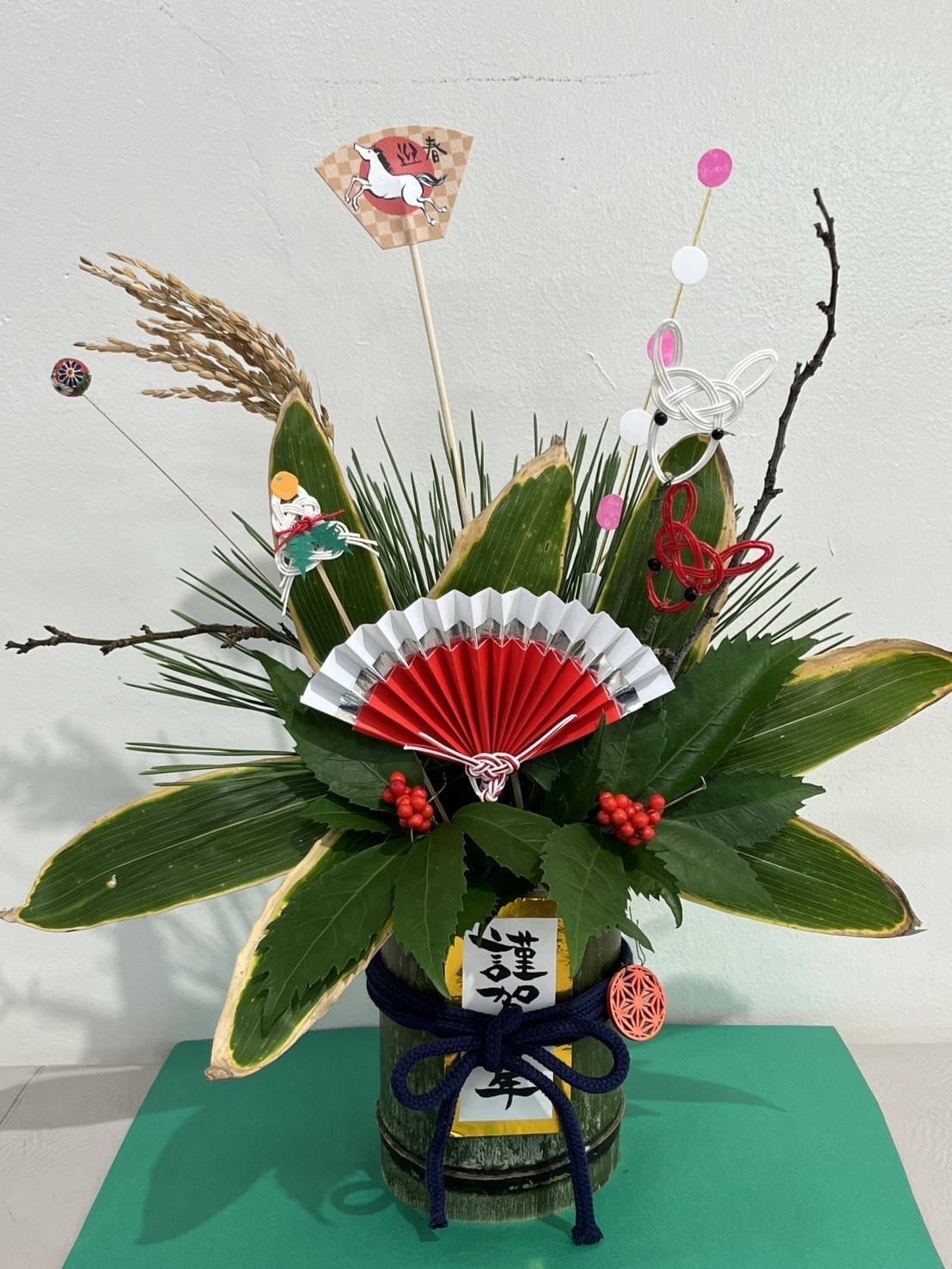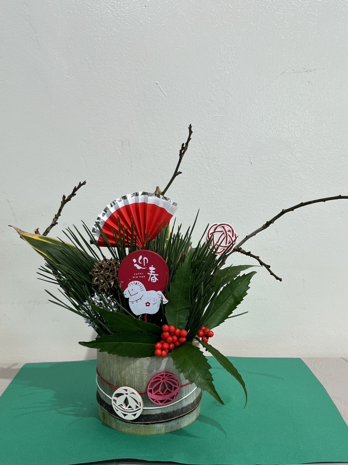 松や梅、熊笹を差し込み、仕上げに飾りつけをして完成させましょう!