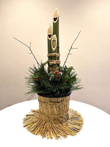 のこぎりで竹を斜めに切り、麻縄でしばり、鉢にこもを巻き、松や梅を飾り完成させましょう!