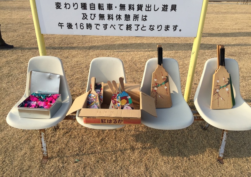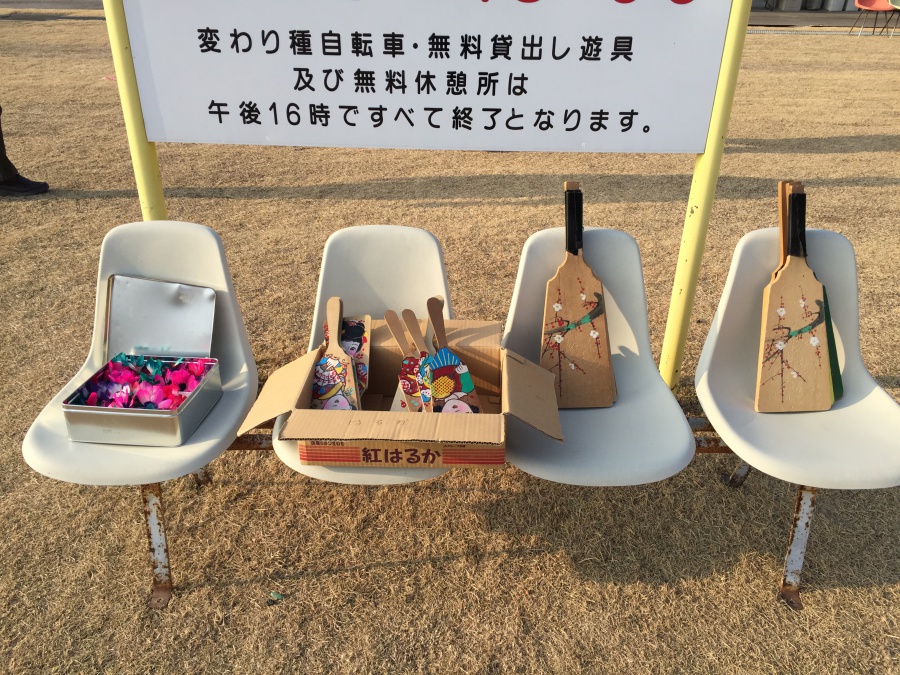 大きな福笑い・独楽回し・羽子板・けん玉・お手玉などで、たくさんあそぼう!