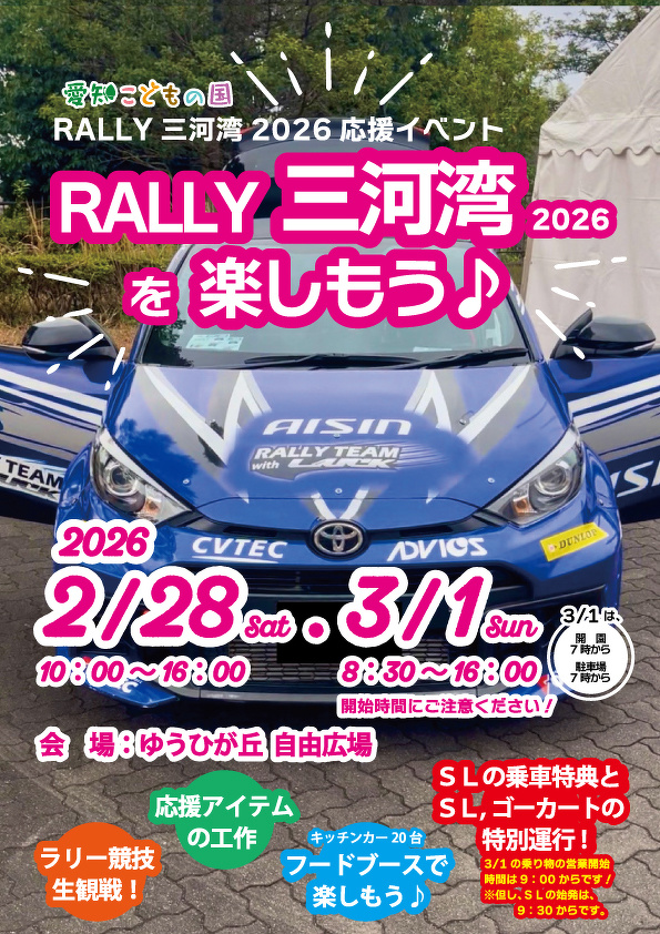 2月28日(土)、3月1日(日) 【予告】RALLY三河湾2026を楽しもう♪ 2月28日(土)、3月1日(日)でRALLY三河湾2026応援イベント「RALLY三河湾2026を楽しもう♪」を開催します! 詳細をこれからこのページにアップしていきます! お楽しみに♪