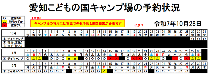 愛知こどもの国キャンプ場の持ち込みサイトの予約について以下の様に変更があります