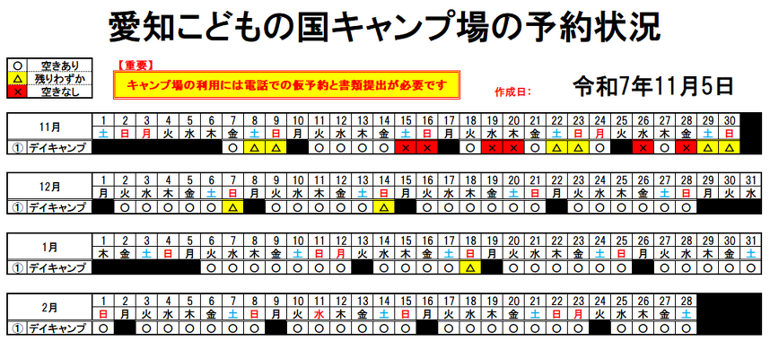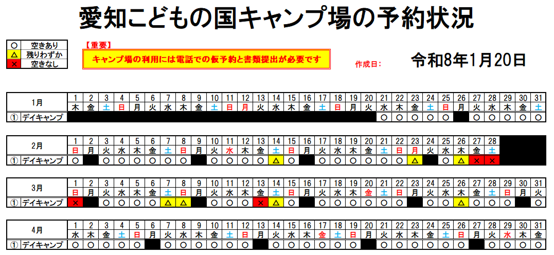 愛知こどもの国キャンプ場の持ち込みサイトの予約について以下の様に変更があります