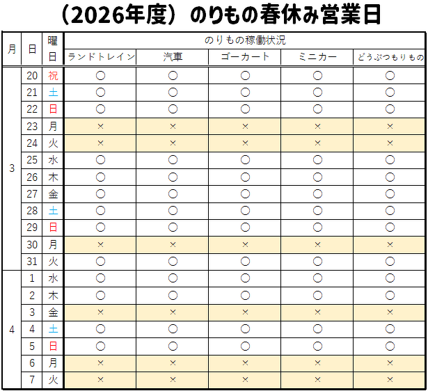 ※3月30日(月)、4月3日(金)は点検及び整備の為、休業日となります
