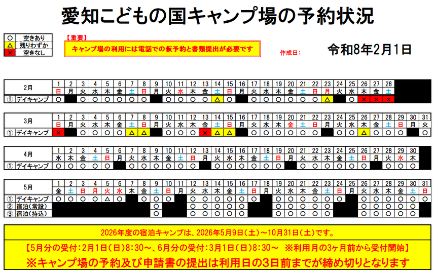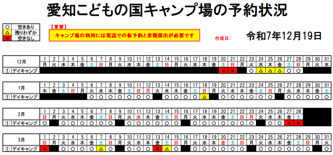 愛知こどもの国キャンプ場の持ち込みサイトの予約について以下の様に変更があります