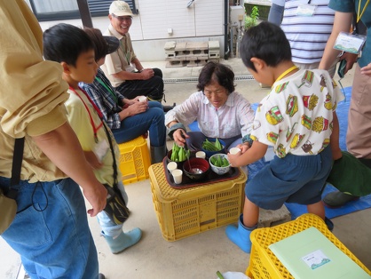収穫作業体験は5月植付けしたキュウリ、ウリ(菊メロン・黄なウリ・黒ウリ)が収穫最盛期になり、この教室でも葉、茎のどの部分についているか観察、収穫方法を受けながら大事に切り取った。キュウリ畝立てを「キュウリトンネル」に仕立て、キュウリがぶら下がり収穫作業をした。キュウリのトンネルは初めての体験で日除け(涼しさ)及び収穫がより楽しくできた。また、サトイモの葉、背丈1.6mと大きく成長し葉が日除け帽子となり、子供さんが喜んだ。