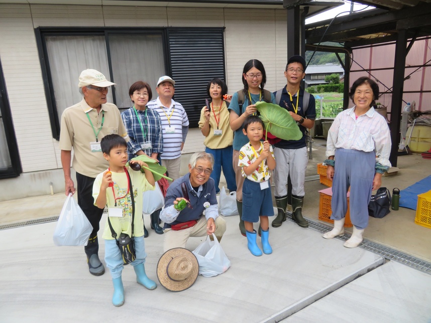 収穫作業体験は剪定、追肥で復活したナス、ピーマン・パプリカ・オクラを収穫した。ある親子連れはオクラの結実姿や表面に細かい毛があることを初めて知ったと。10月に収穫を予定しているサツマイモ、サトイモが大きく成長し楽しみである。今回もサトイモの葉、背丈1.7mと大きく成長し葉が日除け帽子となり、子供さんが喜んだ。