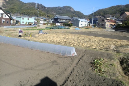また春物野菜(エンドー・ソラマメ・キャベツ)の幼苗の定植をも終わり、定植場所の施肥、整地を並行して農作業等の説明を受け圃場を観た。さらにこの冬場では霜よけ、寒風、寒さ除けに不織布覆い掛けによるトンネルハウス対応の指導を受けた。